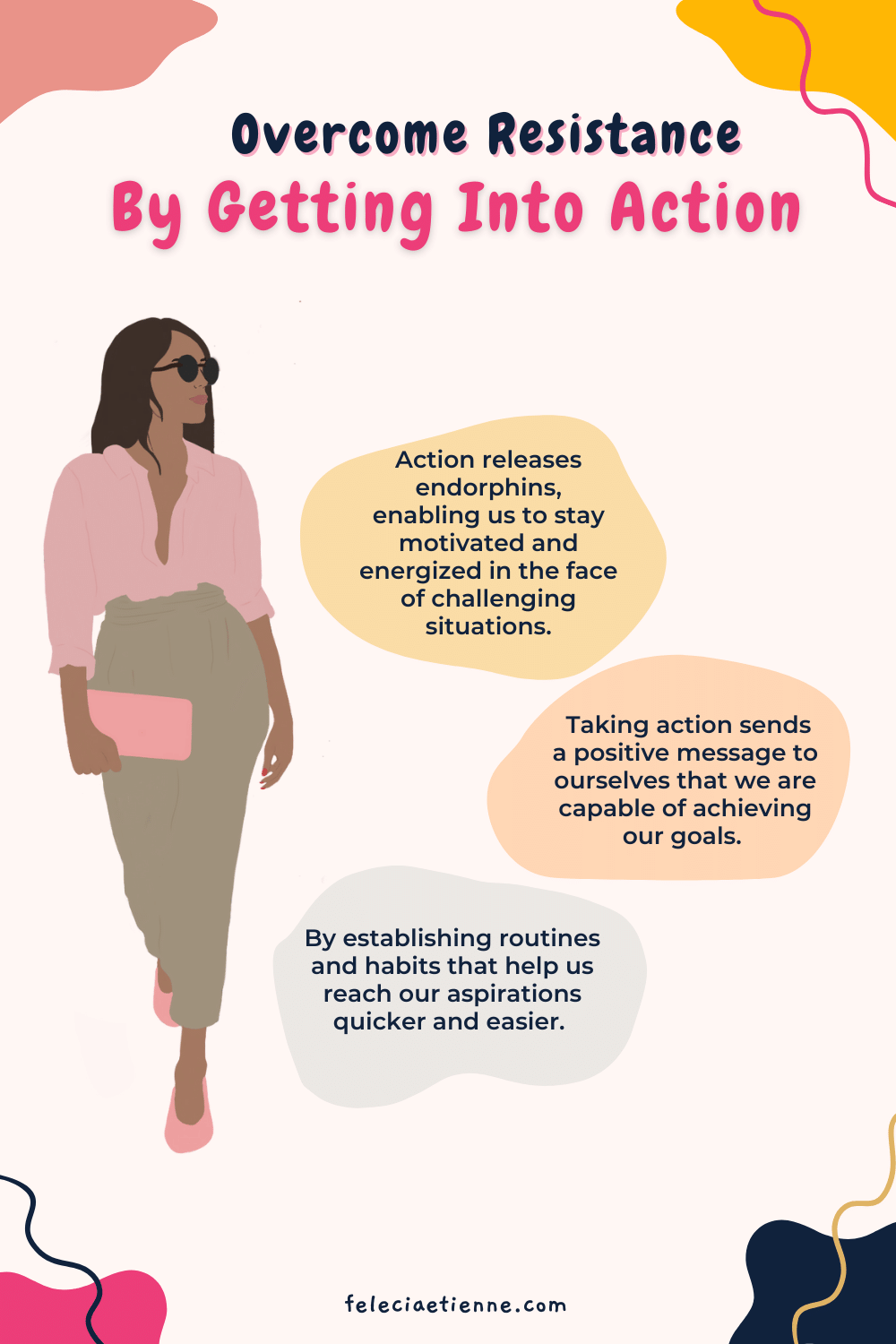 Overcoming resistance is a crucial part of any successful endeavor. One of the easiest and most effective ways to do this is to “get into action.” Taking action can be incredibly empowering, developing our knowledge and building our confidence as we move forward. Action releases endorphins, enabling you to stay motivated and energized in the face of challenging situations. It also sends a positive message to yourself that you are capable of achieving your goals. The key is to make taking action automatic by establishing routines and habits that help you reach your aspirations quicker and easier. Together, this skillful combination of physical action and mental recalibration will have you conquering your resistance quickly.