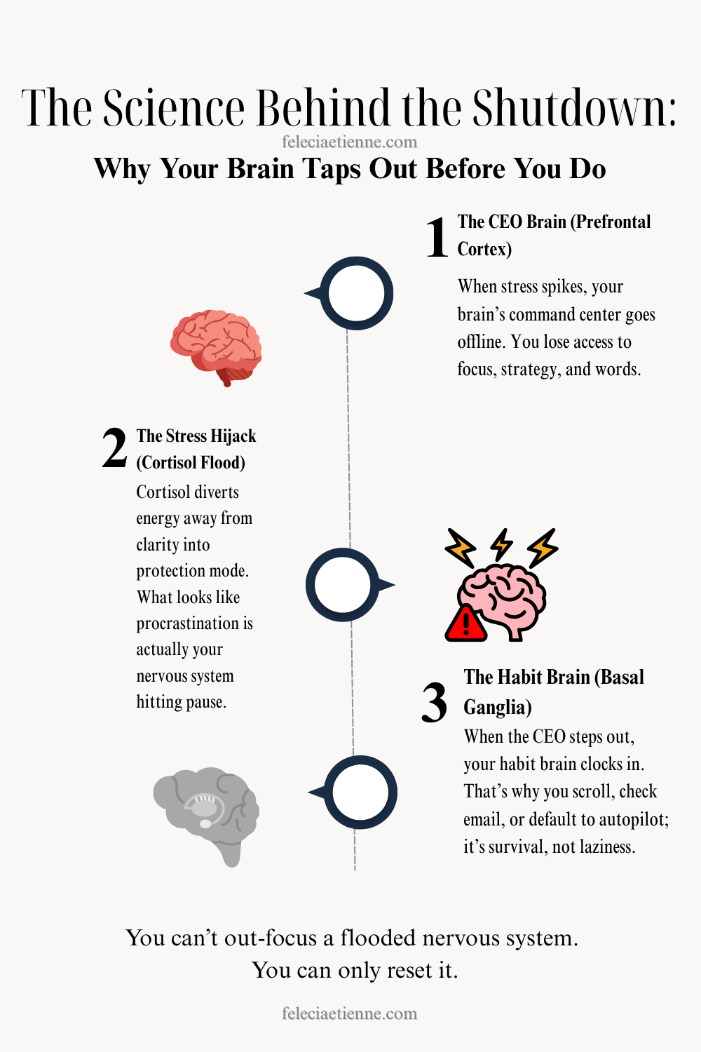 Your stress hormones override clarity. Cortisol diverts energy away from focus and into fight-or-flight. Your body is protecting you from collapse, even if it looks like procrastination.